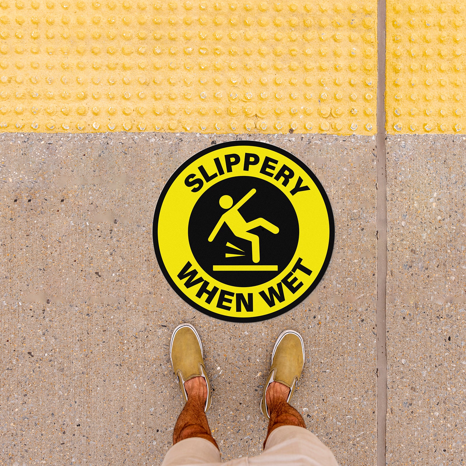 Product Appearance: With the wording “Slippery When Wet” that the big round sticker could be easy to see. Also using high quality ink to provide bright colors and high contrast yellow & black background.
